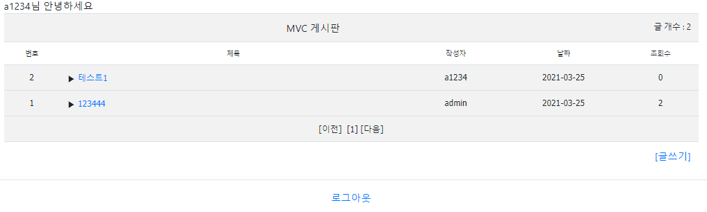 - 게시판 글 출력에서 오른쪽 하단의 글쓰기 버튼을 누르면 나타나는 view